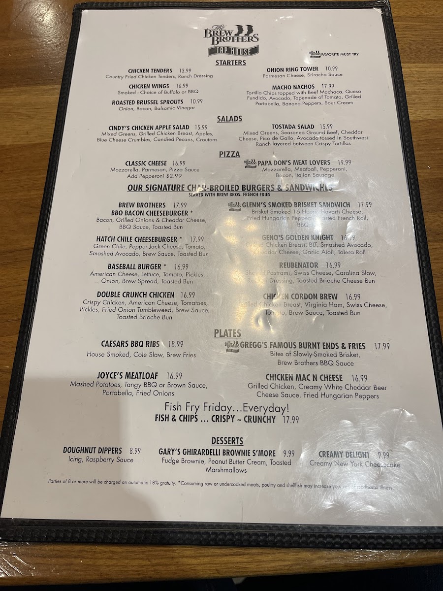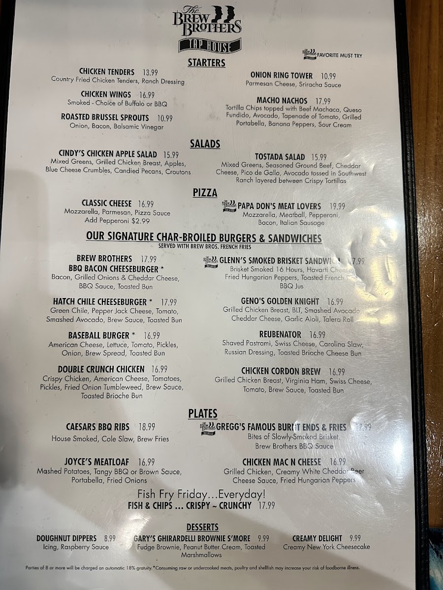 The Brew Brothers specializes in comfort food with a twist, featuring an array of delicious dishes that will leave your taste buds dancing. Indulge in their signature Glenn's Smoked Brisket Sandwich, where slow-smoked brisket is perfectly complemented by Havarti cheese, fried Hungarian peppers, and served on a toasted French roll, all drizzled with flavorful BBQ jus. For pizza lovers, the Classic Cheese, priced at just $16.99, promises a satisfying experience, while the hearty Papa Don's Meat Lovers pizza at $19.99 is sure to satisfy the hungriest appetites.